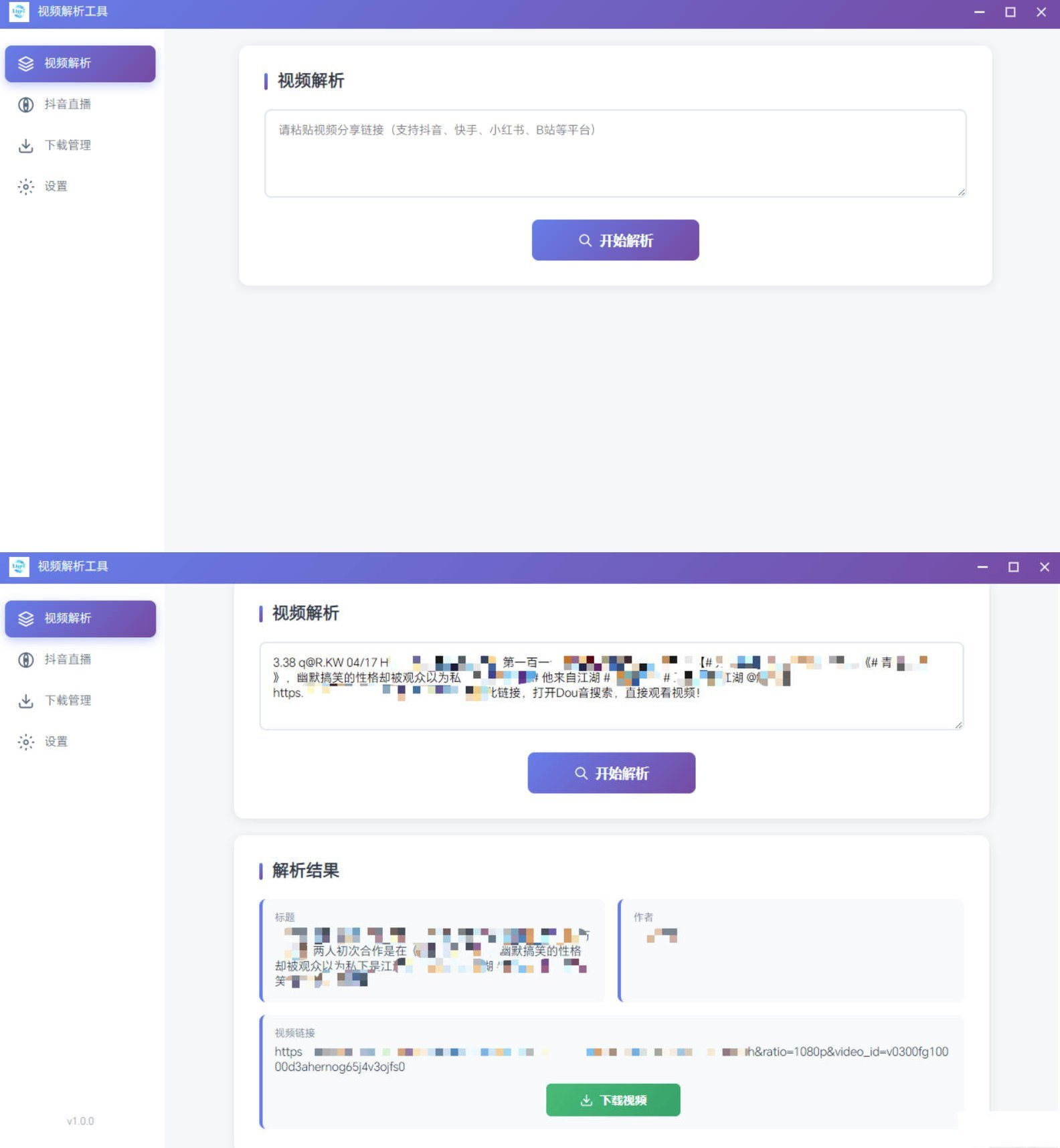 打开软件,在输入框右键粘贴链接,点击"开始解析"按钮