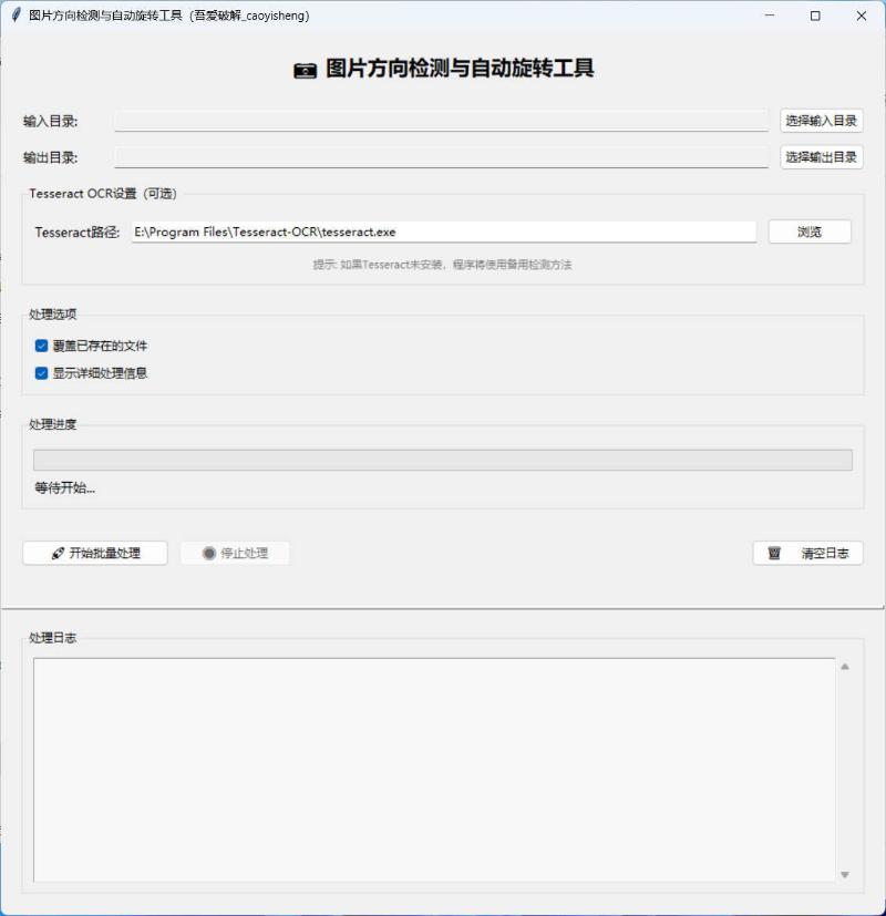 软件介绍 好多图片批量处理的软件,没有看到过批量处理图片方向的,结合AI做了这么一个小软件,请大家试用。 1,小软件只适用于win10、11,为了提高识别率,可以安装压缩包内的OCR软件,最好安装到E盘,里面有使用说明。 2、输入和输出文件夹路径不能包含中文字符。 软件截图
