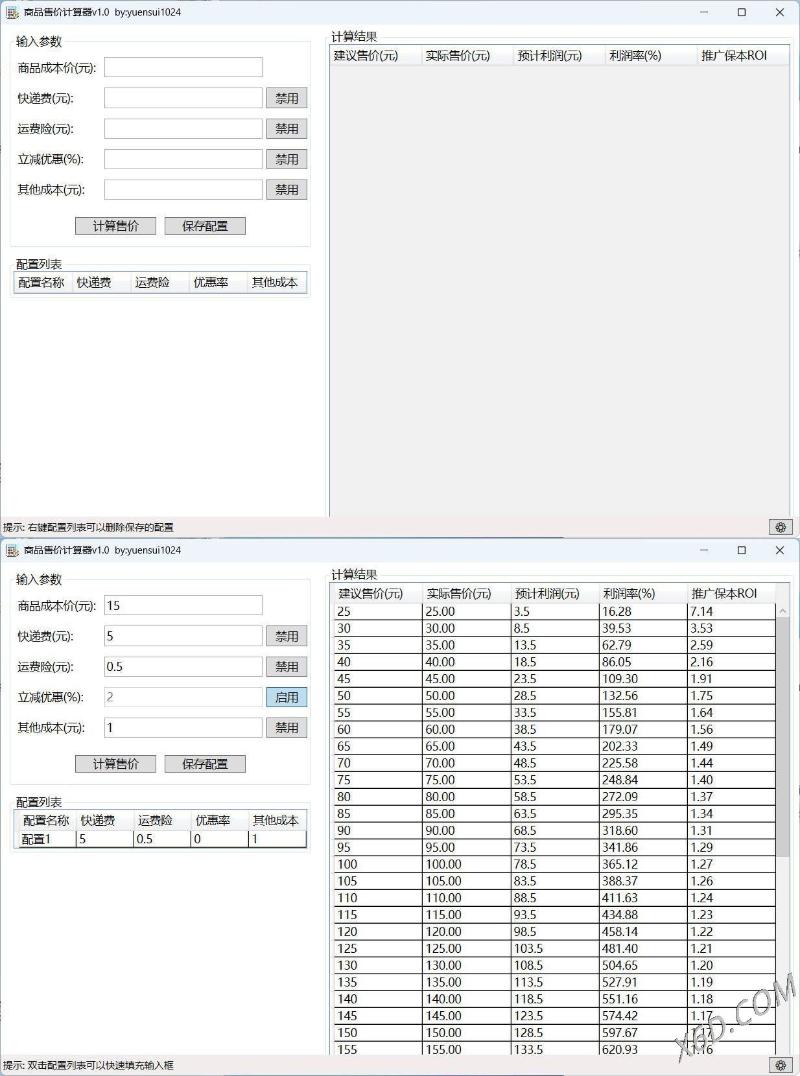 软件介绍 一款简单的小工具,AI写的,就是通过商品成本,快递费,运费险,立减优惠率等计算出不同售价下的预计利润以及利润率 软件截图 <